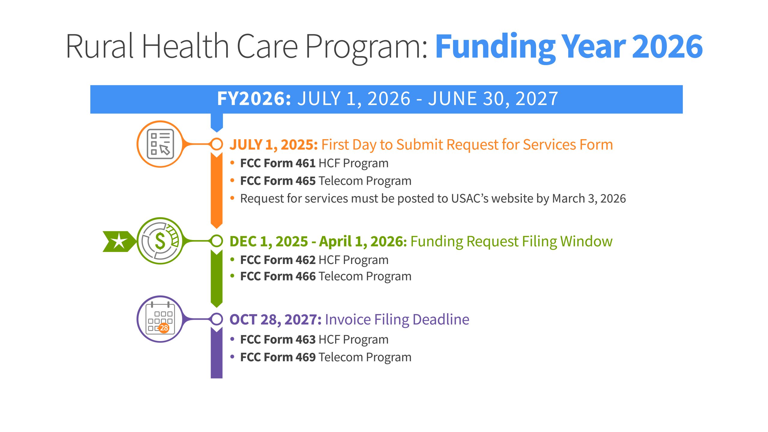 Funding Year (FY) 2026 will take place from July 1, 2026, through June 30, 2027. For FY2026, applicants can begin the competitive bidding process as early as July 1, 2025. The filing window for FY2026 is from December 1, 2025, through April 1, 2026. This means that applicants must submit funding requests (FCC Forms 462 or 466) as early as December 1, 2025, and no later than 11:59 p.m. ET April 1, 2026. We highly encourage applicants to submit forms as early as possible in the filing window. Other forms for FY2026 (FCC Forms 460, 461, or 465) are accepted prior to December 1 to begin the application process.